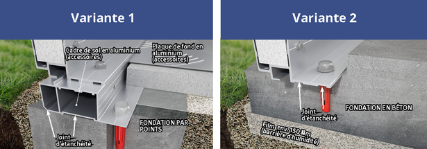 Oui, la plaque de fond en aluminium peut tout à fait être posée ultérieurement. Pour ce faire, un cadre de sol en aluminium est néanmoins nécessaire. Nous recommandons de consolider la plaque de fond en aluminium avec des plaques XPS de 2 à 3 cm d’épaisseur.