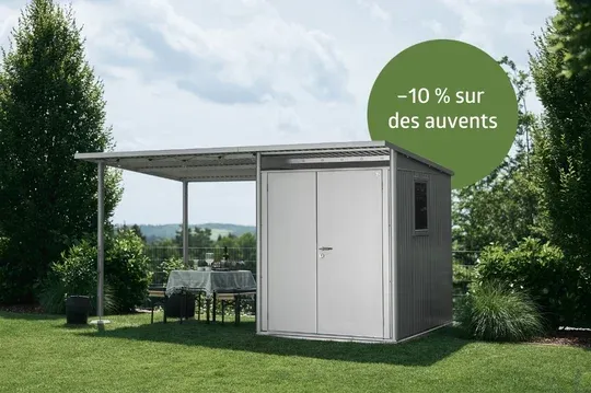 Jusqu’au 12 avril 2026 seulement : 10 % d’avantage prix sur les auvents pour l’abri de jardin HighLine.