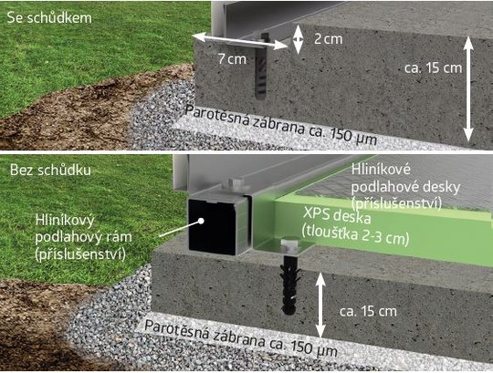 (nelze použít hliníkový podlahový rám ani podlahovou desku) Základovou desku se schůdkem lze také nahradit rovnou vylitou betonovou deskou. Hliníkový podlahový rám jako volitelné příslušenství usnadňuje jak vyrovnání povrchů tak ukotvení a utěsnění Hliníkový podlahový rám také umožňuje využití hliníkové podlahové desky, kterou lze podložit 2–3 cm silnými deskami XPS z polystyrenu. Polystyrenové XPS desky nejsou součástí dodávky.