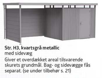 Du kan montere en bagvæg og/eller en sidevæg på sidetaget til dit HighLine®-skur (fra størrelse H2 og opefter). De fås i de samme farver som skuret.