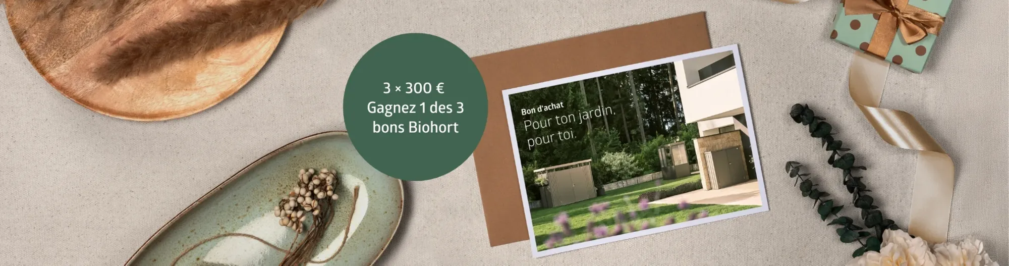 Inscrivez-vous à la newsletter Biohort et tentez votre chance pour gagner l'un des trois bons d'achat Biohort d'une valeur de 300 € chacun, parfaits pour embellir votre jardin, votre terrasse ou votre balcon.