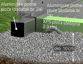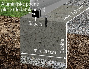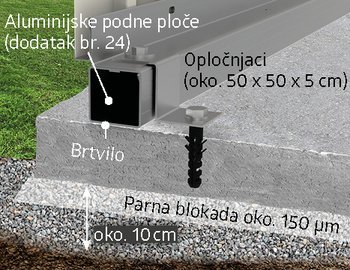 Armiranobetonska temeljna ploča u balastnom sloju je optimalan, ali i skup temelj. Kod ove varijante temelja mora se paziti da ne dođe do prodiranja vode na podu ostave za alat. Za ovo je idealna jedna stepenasta temeljna ploča s obodnom stubom od 2 cm do 7 cm. (Aluminijski podni okvir i aluminijska podna ploča nisu prikladno rješenje.) Alternativa stepeničastoj temeljnoj ploči sa obodnom stubom može biti potpuno ravna betonska ploča. Kao dodatak raspoloživi aluminijski podni okvir olakšava izravnavanje neravnina na tlu kao i postavljanja brtvenog spoja. Aluminijski podni okvir omogućuje upotrebu aluminijske podne ploče kao i podstavljanje XPS ploča od čvrste pjene debljine 2-3 cm. XPS ploče od tvrde pjene nisu uključene u opseg dostave.