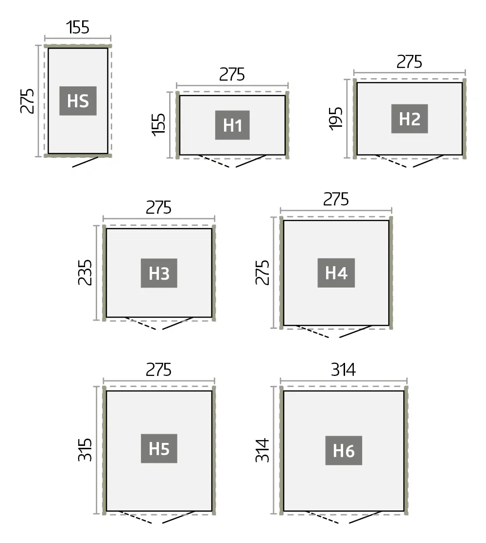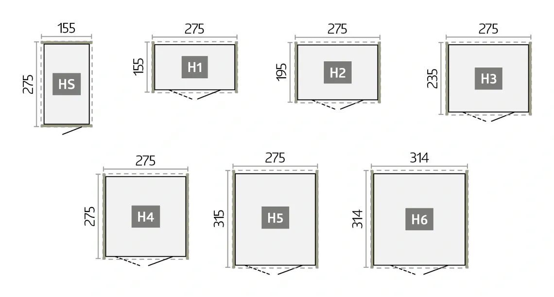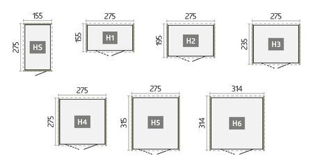 | Formati H = posizione più alta incl. sporgenza del tetto | L: 172-316 cm | L: 180-260 cm | L: 273 cm | L: 155-315 cm | L: 180-348 cm | L: 330-430 cm |