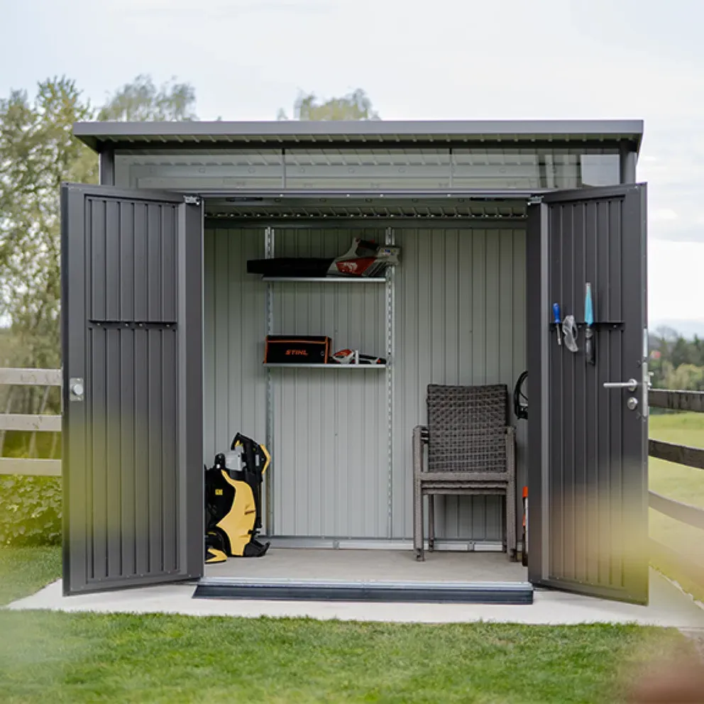 Biohort Gerätehäuser aus hochwertigem, verzinktem Stahlblech sind robust, wetterfest und wartungsfrei. Sie trotzen Regen, Schnee und Wind, ohne zu rosten oder sich zu verziehen – und das über Jahre hinweg.