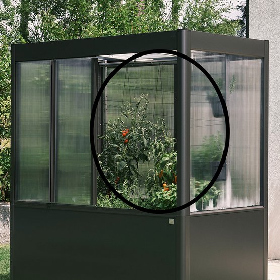 Et kompakt drivhus utviklet for høyvokste planter – perfekt for uteplasser med begrenset plass. Den gjennomtenkte kombinasjonen av opphøyde bed og spesialtilpasset drivhustopp skaper et beskyttet mikroklima, som gir optimale vekstforhold og forlenger hagesesongen. Tilbehør som espalier og vanningssystem gir målrettet og effektiv plantepleie. Hagearbeid kan både være funksjonelt og se bra ut. Med sitt moderne design og førsteklasses kvalitet blir drivhuset et arkitektonisk blikkfang i hagen. Selv på liten plass er det rom for store hagedrømmer.
