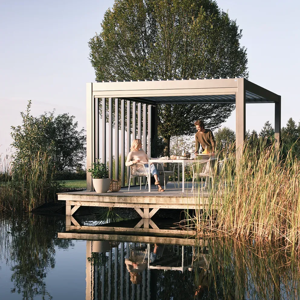 High quality. Modern. Comfort in all weathers thanks to innovative sandwich construction for significantly reduced noise and heat radiation from the roof. A wellness oasis for any outdoor area, extendable with LED lighting, a sun screen, and an adjustable louvred sidewall for more privacy.