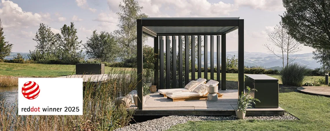 La pergola de Biohort a été récompensée en 2025 par le Red Dot Design Award. Des lignes claires, des matériaux de haute qualité et une finition précise en font un lieu de retraite élégant en plein air. De la première ébauche à la production en série, la pergola a été entièrement développée chez Biohort.