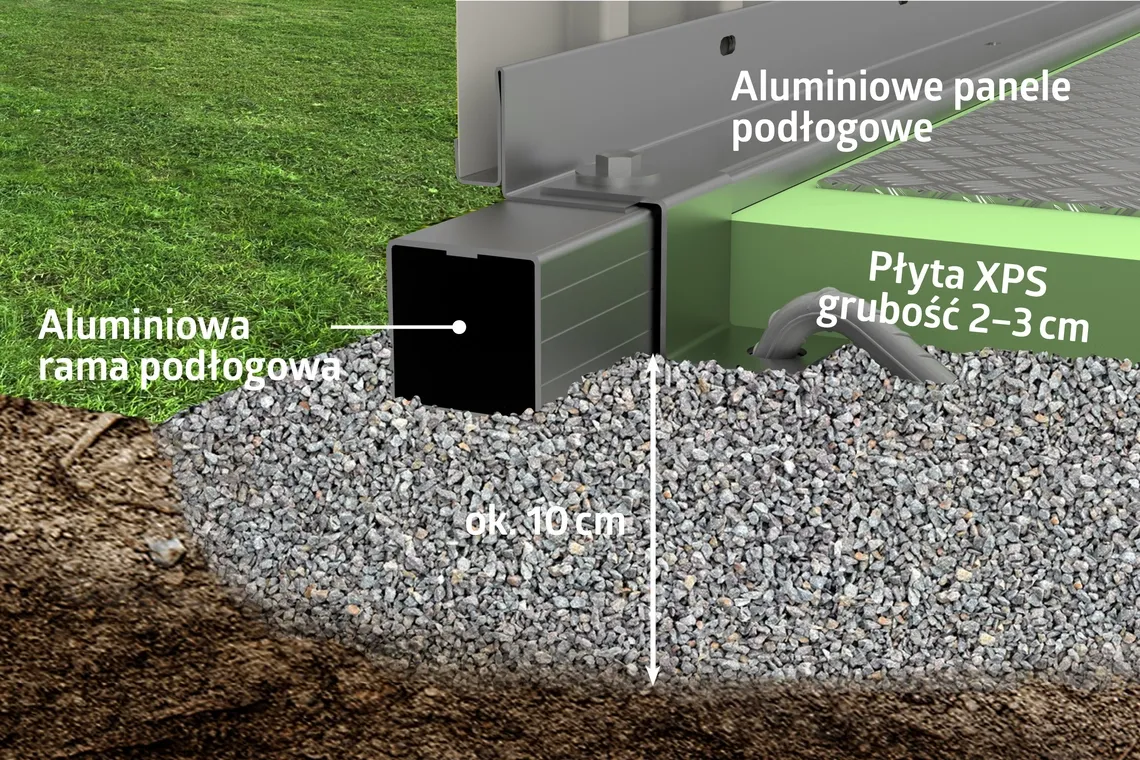 Funkcjonalną podłogę można stworzyć za pomocą aluminiowego panelu podłogowego, który jest dostępny jako akcesorium. W takim przypadku zdecydowanie zaleca się umieszczenie twardych pł