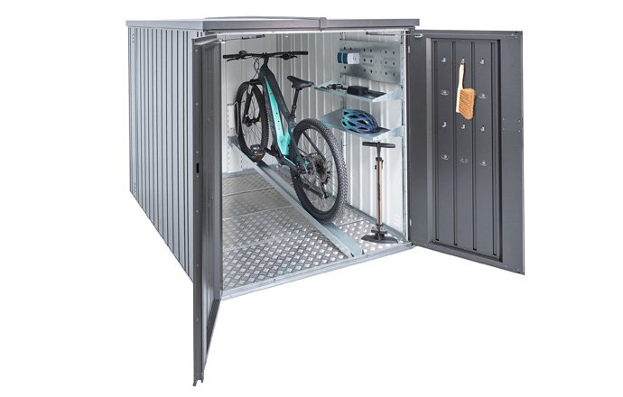 Tuż przed domem, natychmiast gotowy: deszczoszczelny garaż rowerowy Storemax® z "BikeHolder" oferuje maksymalną ilość miejsca bez konieczności zajmowania dużej przestrzeni - idealne wymiary dla maks 2 rowerów. Bardzo płynnie działająca roleta pomaga oszczędzać energię na wycieczkę rowerową i chroni rower za pomocą solidnej blokady cylindrycznej.