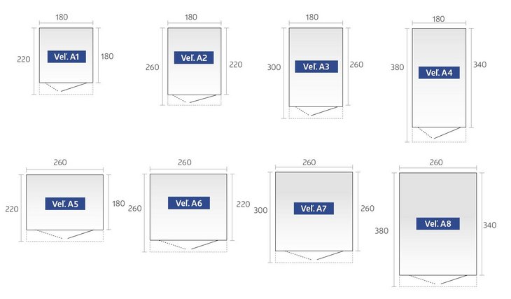 | A8 | 260 x 380 x 222* | 252 x 322 | 257 x 327 | 281,5 | 9003414 15080 5 | 9003414 19080 1 | 9003414 17080 3 |