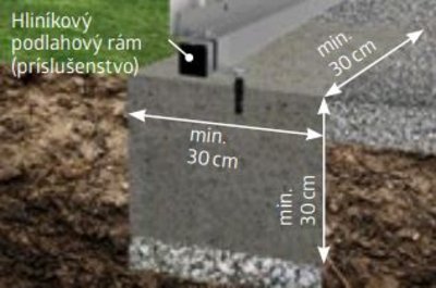 Vyarmovaná betónová základová platňa na štrkovom lôžku je optimálny, ale drahý základ. Aj pri tejto variante základu musíte zabezpečiť, aby do domčeka na náradie nevnikala od podlahy žiadna voda. Odsadená základová platňa s obvodovým stupňom od 2 cm x 7 cm je k tomu ideálna. Alternatívne k betónovému základu s odstupňovaným povrchom môže byť aj odliata betónová rovná platňa. V rámci príslušenstva dostupný hliníkový podlahový rám uľahčí prípadné vyrovnaie podlahových nerovností. Hliníkový podlahový rám umožňoje použitie hliníkových podlahových platní a podloženie s platňami z tvrdeného XPS (nie sú predmetom dodania).