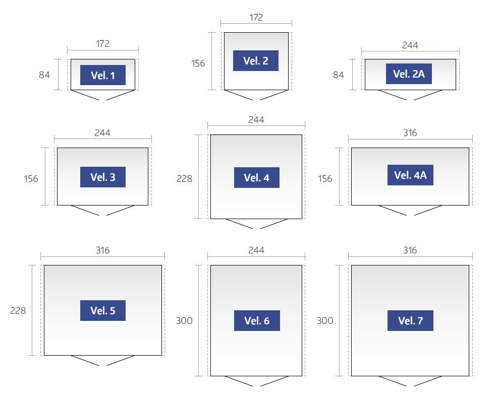 | Napotek: Če je talni okvir položen direktno na gramozno podlago (cca. 10 cm gramoza, brez temeljev ali plošč), so za pritrditev na tla potrebna talna sidra. Odpornost proti nevihti mora zagotoviti kupec. Za velikost 1: 4 kosi skupaj; za velikost 2, 2A: 6 kosi skupaj; za velikost 3, 4, 4A: 8 kosi skupaj; za velikost 5, 6, 7: skupaj potrebujete 10 kosov. | |