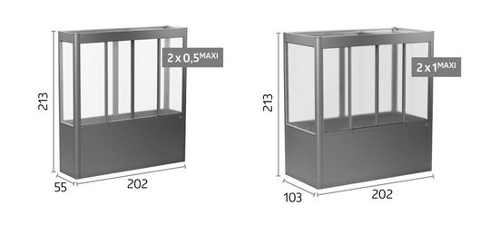 | 2 x 0,5 MAXI | 201,6 x 54,8 x 213,4 | 193,4 x 45,7 x 206 | 100,7 | 1.820,7 | 9003414 95400 7 | 9003414 95399 4 |